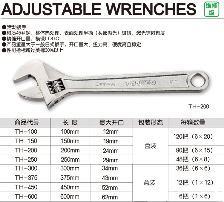 1.活扳手. 2.材质45#钢,整体热处理,表面处理半抛(头部抛光)镀铬,激光镭射刻度. 3.精确开口量,模锻LOGO. 4.产品重量大于一般日式扳手,开口量大,扭力高,硬度高且稳定. 5.性能指标超过美标30%以上.