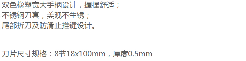 1.软性橡塑手柄,进口刀片 0.5mm厚,不绣钢刀套.