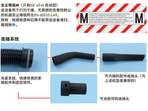 1.自动过滤清洁系统(全自动) 优势:稳定的真空吸力,不需要动手调节。 2.连续的速度调节(除ISS 35外) 优点:可根据各自的使用情调节速度 3.过滤器不会占用吸尘器太多空间 优点:可获得吸尘器筒空间的最佳利用率。 4.包括使用的配件夹子 优点:快速牢固的连接。