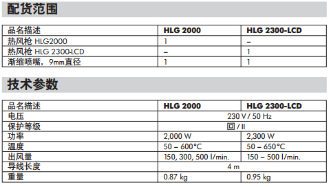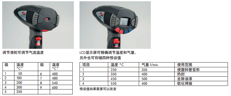 1.坚硬的陶瓷加热器 优点:寿命长,对振动敏感低 2.质量轻,符合人体工程学 优点:长时间工作时,无疲劳感 3.只对HLG 2300-LCD适用: LCD显示 优点:可以存储常用的设置,另外,也可以进行简单的温度和气量调节