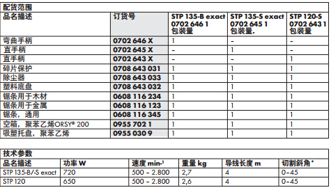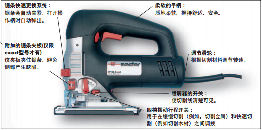 底盘无需工具就可调整 底盘与切割面的角度在45°内可调。 工作时无振动 工作时对手腕的作用力很强。 平稳起动 机器启动平稳,因此延长了马达的作用寿命。 3年质保 质保期内所有存在材料和制造缺陷的都可免费更换。 仅限exact型号: 附加锯条木板:锯条保持竖直,在边界处不会脱离,可使切割更加精确和保持直线。