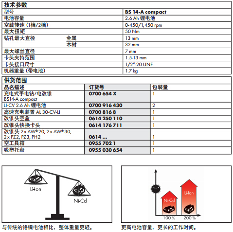 1.2.6Ah锂电池 轻巧,高效且无记忆效应。充电后工作时间长。 2.部件采用人体工程学设计,更加舒适,手感舒适,无疲劳感。 3.配有LED灯光 提供工作时的最佳照明。 4.高性能的双齿轮行星轮传动装置 较长的使用寿命和最佳的动力传输。 5.过载保护 避免过载对电池造成损害。