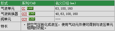 ●CCT规格: 环境以及流体温度(℃) : 5-50, 使用压力范围(bar) : 0-7 ●产品特征: 把空气压转化成液压,使用气动元件便可得到与液压单元相同的功能