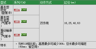 ●MY3A规格: 使用压力(bar) : 1.5-8, 温度范围(℃) : 5-60, 执行形式 : 双作用, 磁性 : 有 ●产品特征: ·高度小,总长短,重量轻